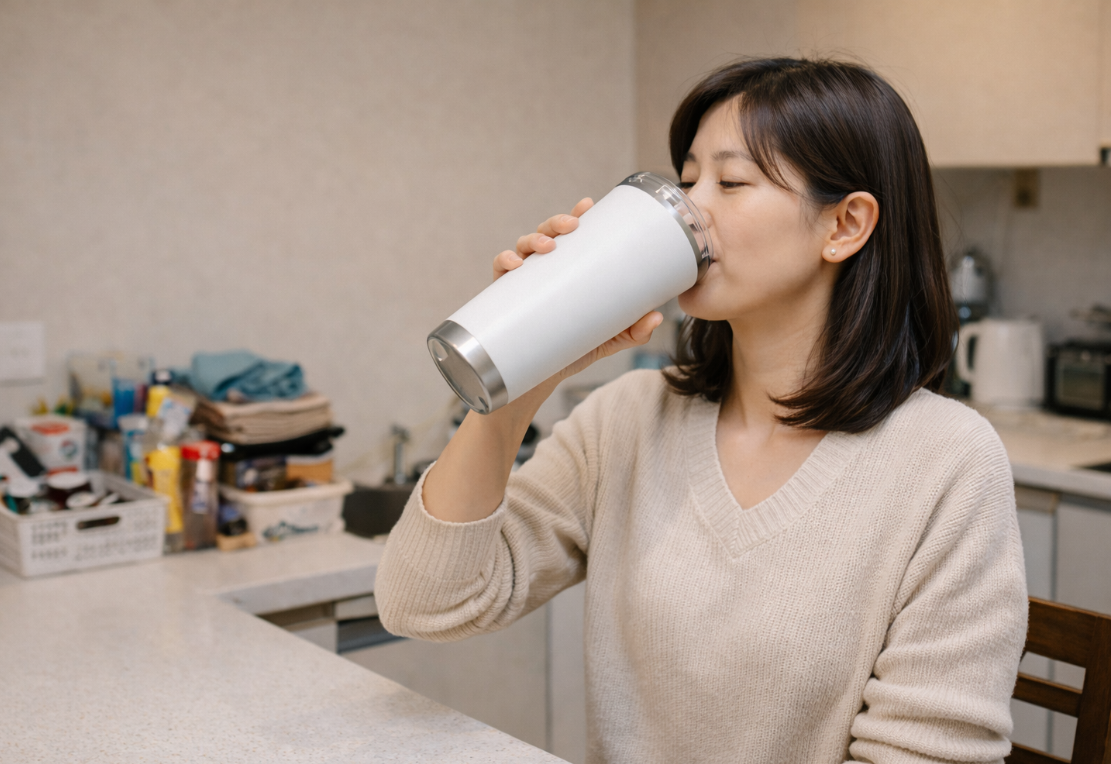 조금 큰 용량의 텀블러나 500ml 생수병을 손에 꼭 쥐고 다녀보세요. ‘오늘 하루는 2L를 마셔야지!’란 생각으로 4번 리필해서 다 마시는 거예요.